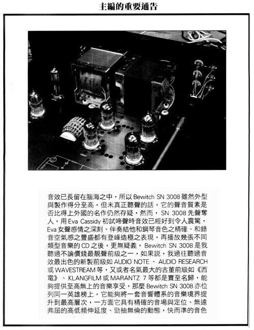 广州《天进音响》设计和制造的Bewitch SN 3008系我历来听过出自中国大陆最靓声的真空管前级,它声音质素之高、设计之精密与制作之无所不用其极令我聆听时惊喜莫名,万万想不到今时今日我国的高级音响设计师已经发烧到这个地步,我过去三十多年来听尽天下名器,但就从未见过一部新制真空管前级对胆机靓声之道有如斯透彻的认识,而又在落实重播音乐时能够将感情、气氛、韵味、细节和其他各种慑人的Hi-Fi音效发挥得如斯淋漓尽致。